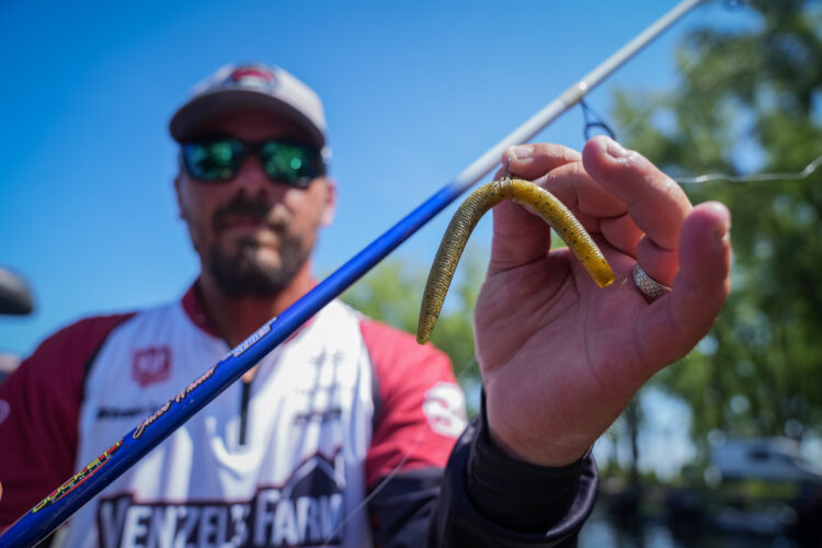 1. Leading the charge of anglers in the Top 10 who locked into Pool 7 despite a chaotic and often tense lock traffic situation, Matthew Stefan focused on a stretch of eelgrass with a plethora of clumps and pockets for bass to hide in. He exploited these clumps and patches of vegetation with a wacky-rigged 5-inch Berkley PowerBait MaxScent The General in both green pumpkin and black and blue. Stefan was sure to alternate between black and blue on cloudy days and green pumpkin when the sun shone.
