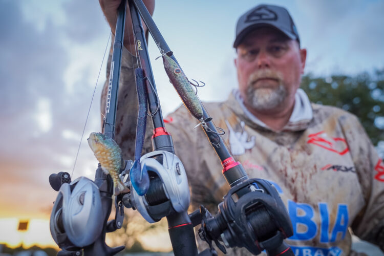For winding, he used a ½-ounce black-and-blue Z-Man/Evergreen ChatterBait Jack Hammer. Throwing a green pumpkin RaZor ShadZ as his primary trailer, he went to a Missile Baits D Bomb in bruiser flash when he ran out.