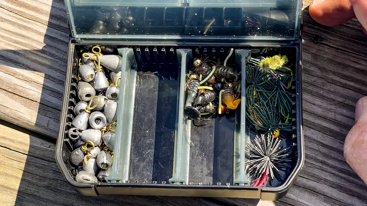 With a small zipper pouch that I got off of Amazon and one small jig box from Gamakatsu, I can carry everything I need in one big pocket or through it in a backpack. So let us get into what you need for the ultimate bluegill panfish fishing kit.