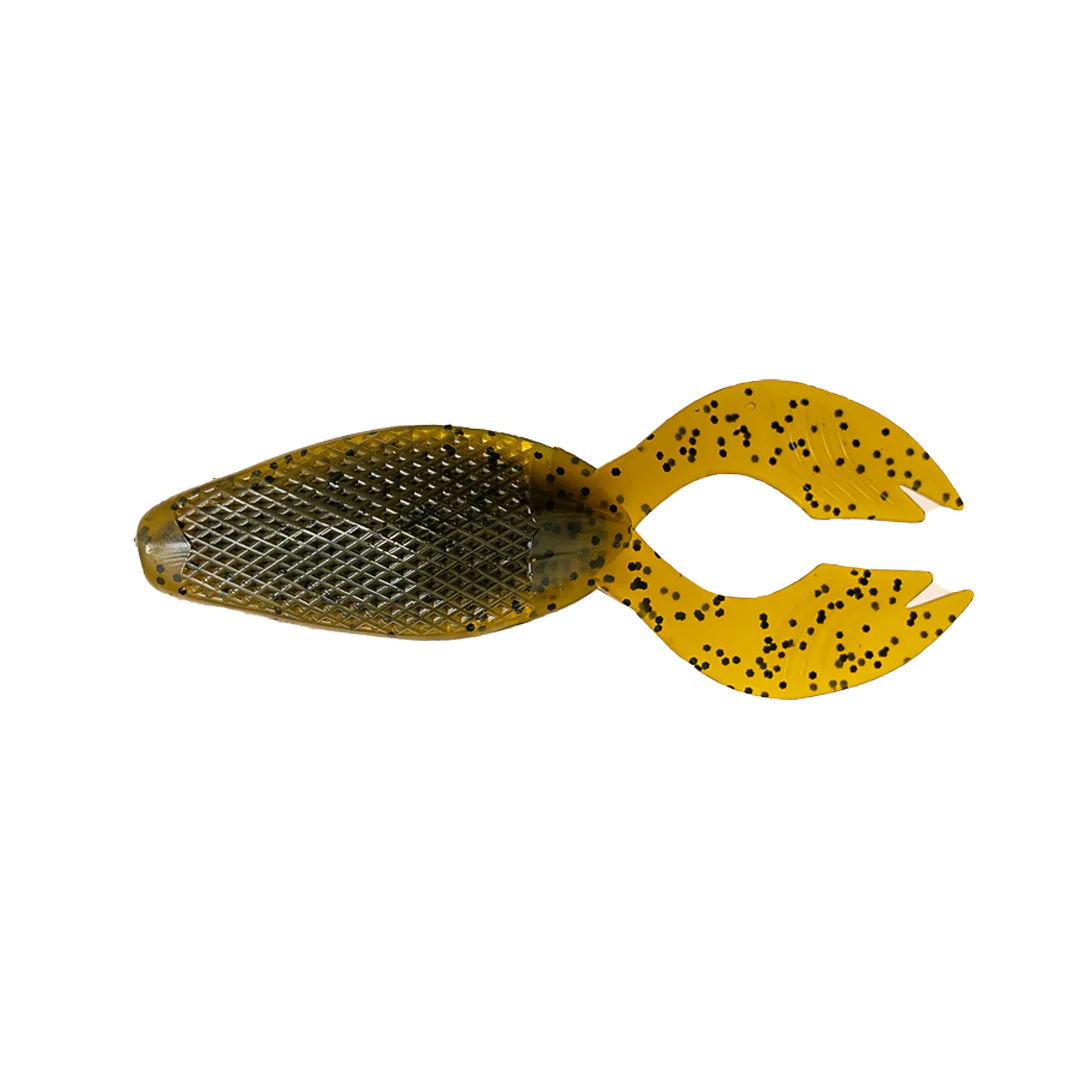 Very unique when rigged through the slit in the bait. It lasts longer and has a claw-kicking action that has no peers and gets bit many times on the fall.