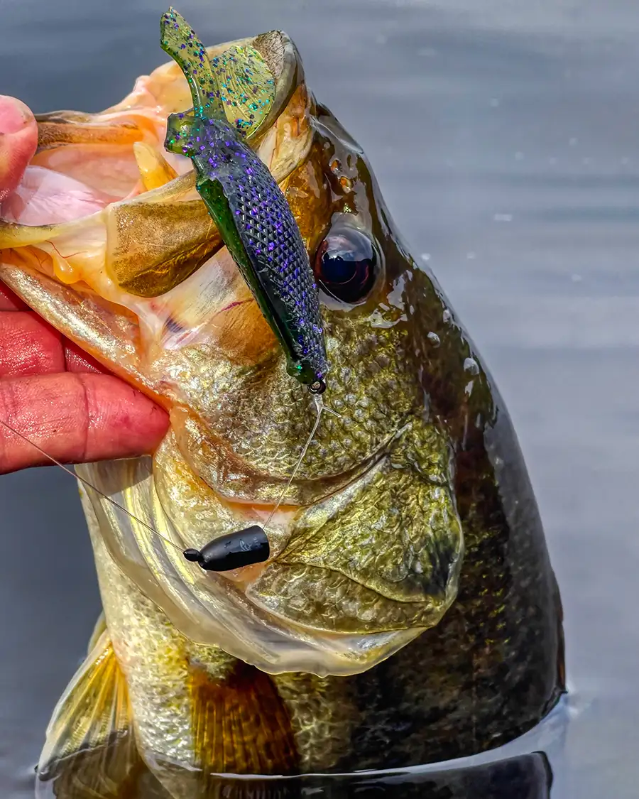 The Sucka Punch is a thin, wide bait. This makes it perfect for lures that you want to keep high in the water column. Swim jigs are a good example of this. Sliding the Sucka Punch up on the back of your favorite swim jig will help your jig ride higher in the water column, and also allow it to be reeled more slowly if you’d like. The same is the case if you use this soft plastic on a buzzbait. The wide and thin body along with the claws will help the buzzbait stay on top better, as opposed to using a slender small swimbait for instance.