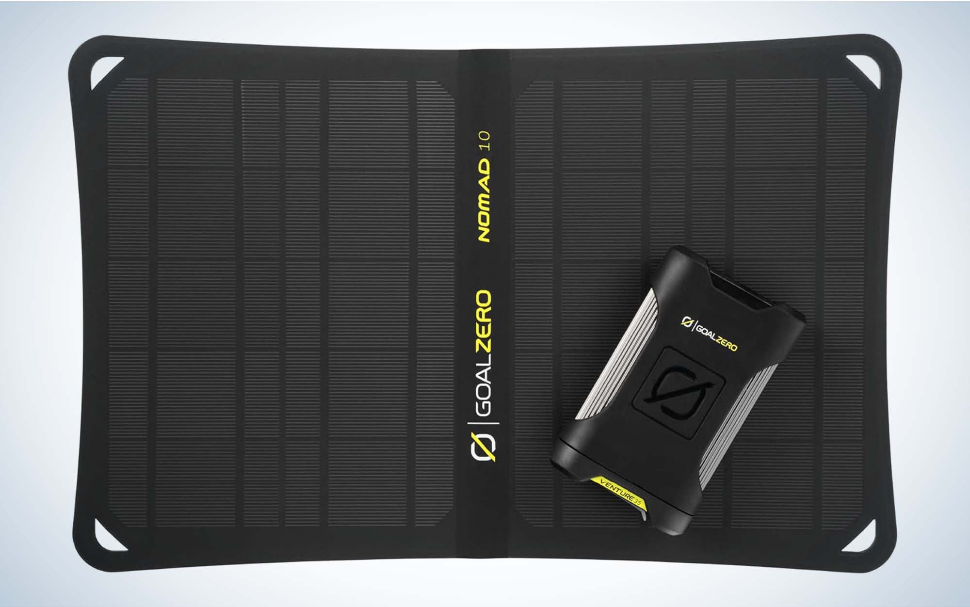 I like this option from Goal Zero because the whole kit is small enough to fit into your glove box and light enough to take on a short backpacking trip. The power bank itself holds 9,600mAh, which is enough to power up your smartphone multiple times, while the solar panel can generate up to 7.5W at a time.