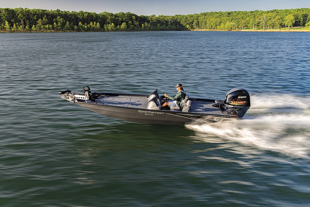 The Sportsman 1910 is solid, sure-footed and fun on plane. We clicked off speeds just a hair over 50 mph with a Yamaha 150 SHO twisting a 14.5-inch-by-21-inch stainless-steel three-blade Yamaha wheel. Just 2 inches shy of 20 feet, and weighing 1,375 pounds dry, it’s tough and swift. With a 450-pound two-passenger load and a half tank of fuel, it ripped from 0- to 30- mph in just 4.4 seconds. That’s dragster acceleration, especially for a ’bitty one-fitty. Fuel economy proved equally impressive at 7.3 mpg at 27.4 mph. Even at full bore we made 3.5 mpg.