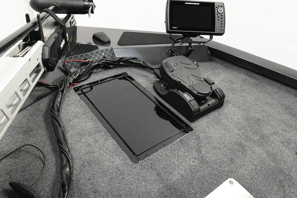 A recessed trolling motor pedal keeps the back strain at bay. The fore and aft decks are roomy enough for two anglers to fish without bumping into each other.