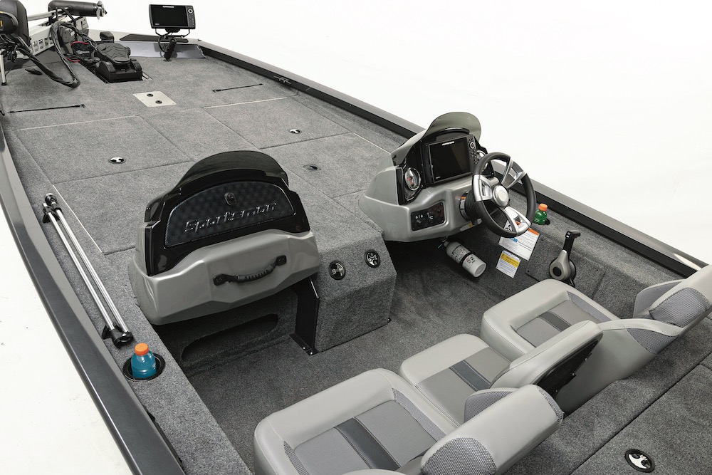 A 33-gallon divided livewell is automatically aerated, and flanked by twin tackle storage boxes. A large aft hatch gives access to the batteries, engine rigging, and an optional three-bank charger.