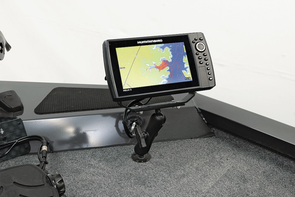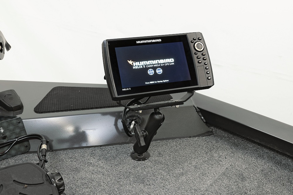 The Sportsman has a thick, .100-gauge aluminum all-welded hull. The bow features large dry storage boxes as well as tackle storage lockers flanking the center rod locker. Our tester was equipped with an optional MinnKota Ultrex trolling motor; a Maxum 24v 70-pound thrust troller is standard. A Helix 5 CHIRP graph on the dash is standard; ours had a 9-inch Helix graph with CHIRP sonar at the bow and a second Helix 9 on the dash.
