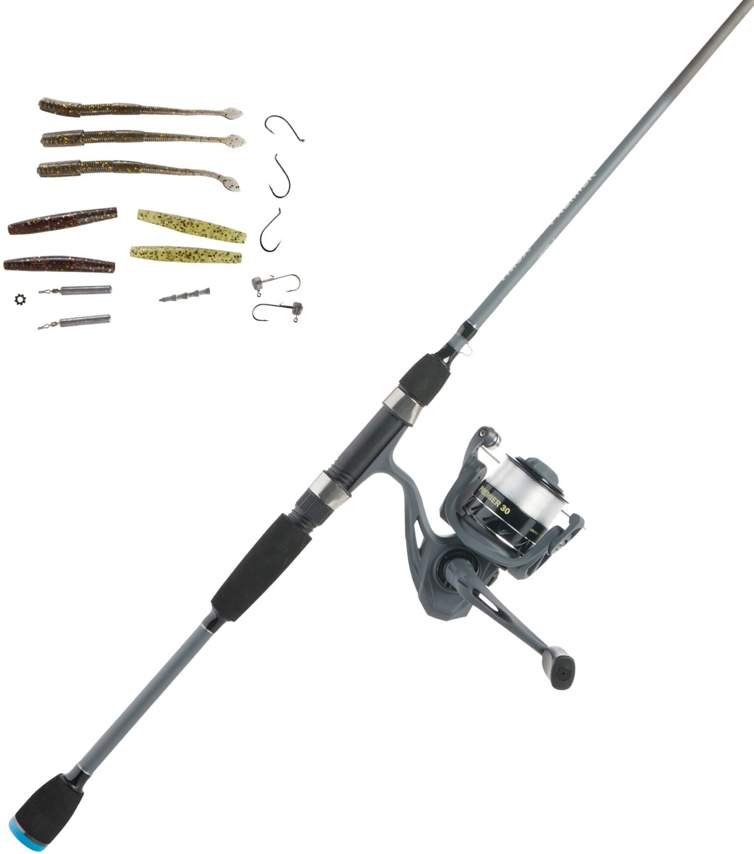 The combo features a 7-foot, 1-piece, medium IM6 graphite spinning rod with a lightweight composite reel seat, aluminum oxide guides and split-grip EVA handles. The prespooled 5.1:1 reel has four ball bearings, a lightweight composite frame, anodized aluminum spool and lightweight composite reel handle. The Finesse Bait Kit includes three finesse worms, four Ned baits, two drop-shot weights, two nail weights, two jig heads and three drop-shot hooks.