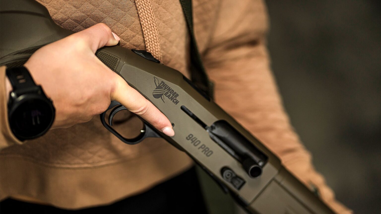 A hunter aims a shotgun in the air.
