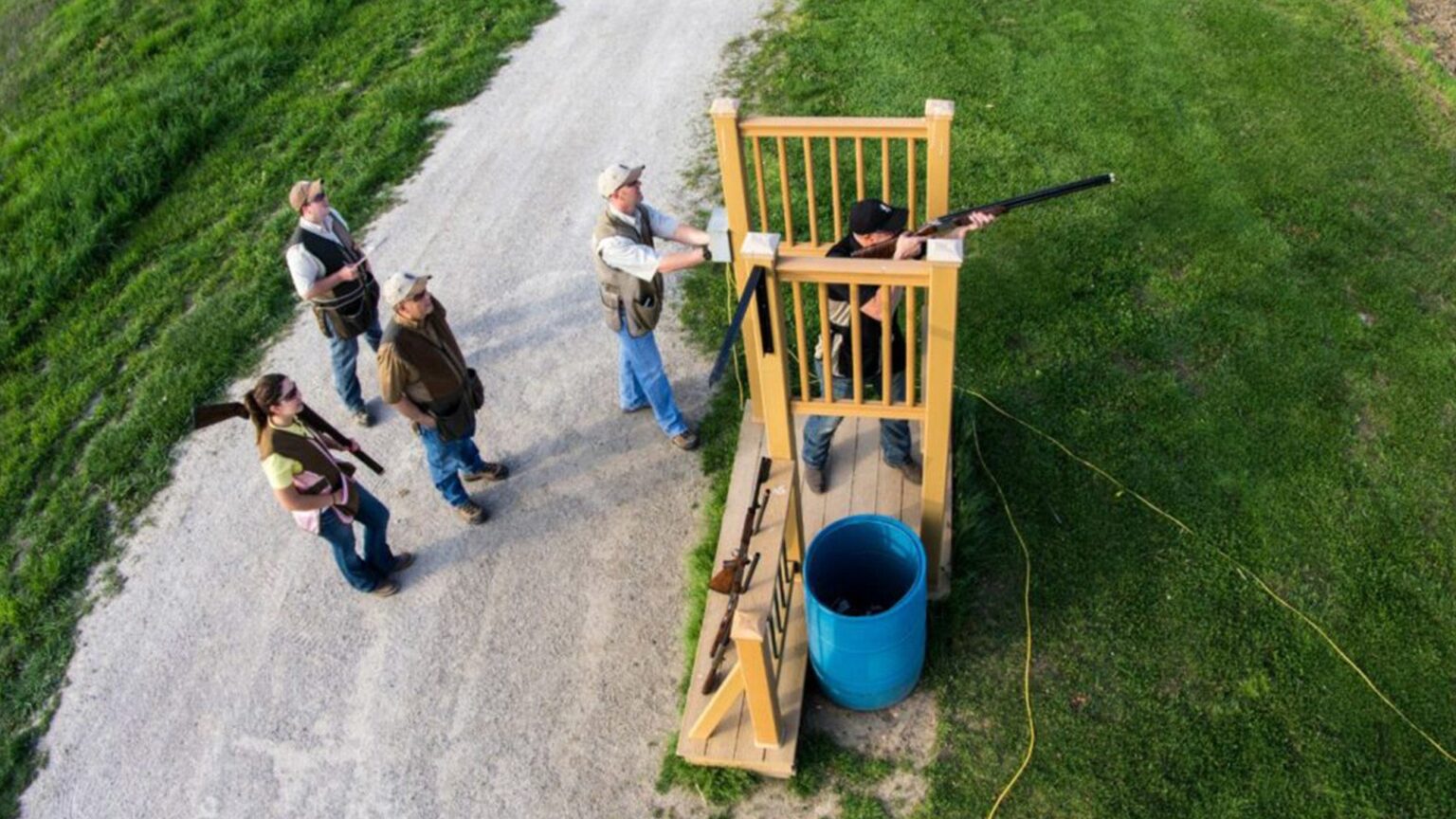 You shoot from a cage at each station, although that cage can be anything from an elaborate raised wood platform to some PVC pipe to a hula-hoop on the ground. Wait until you’re standing in the cage to load two shells. Your muzzle goes over the waist-high barrier and downrange when you load, not inside the cage. When you’re not shooting, your gun is either pointed down at the ground with the action open, or it’s in a rack. Point your finger, not your gun, at show targets if you’re not in the cage.