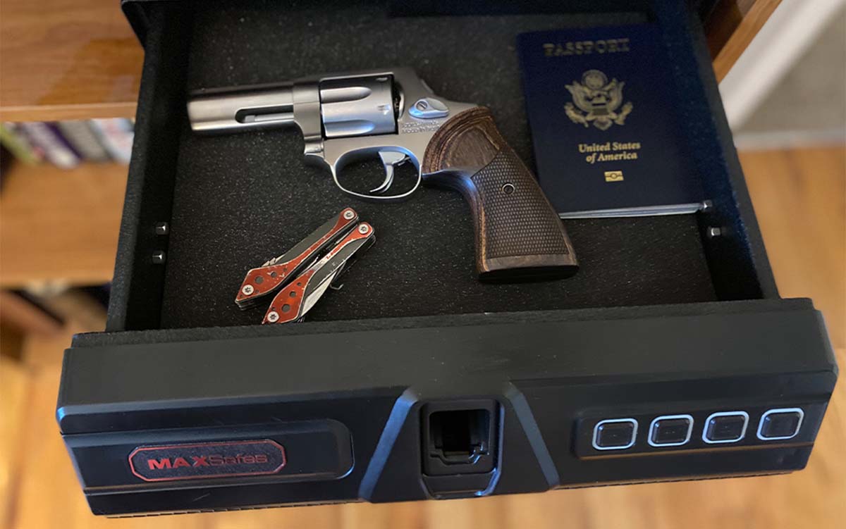 The easy to install Underdesk Safe from MAXSafes features one of the best biometric recognition systems. Dubbed Vein Recognition, a small door located in the drawer of the safe allows for finger insertion during setup, and in three easy steps, the safe will scan and store your vein pattern. Of course, the safe also allows for PIN and standard key entry, but after scanning my finger, I had no trouble opening the door. And the Silent Mode keeps the safe hushed. MAXSafes claims this one will hold a pair of full-size handguns, but it’s a tight fit. For an added bonus, the padded drawer is fitted with pre-cut foam that allows you to custom fit your handguns.
