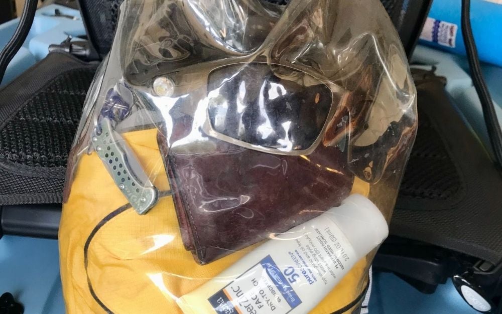 Nothing stays dry on a kayak. Even inside the hull, water will puddle and eventually soak gear. And, gear in kayaks is subject to rough treatment, which makes a tough material mandatory. A bag that allows you see what’s inside is best, so you won’t have to sort through all your stuff and risk it getting wet while you’re looking for what you want.