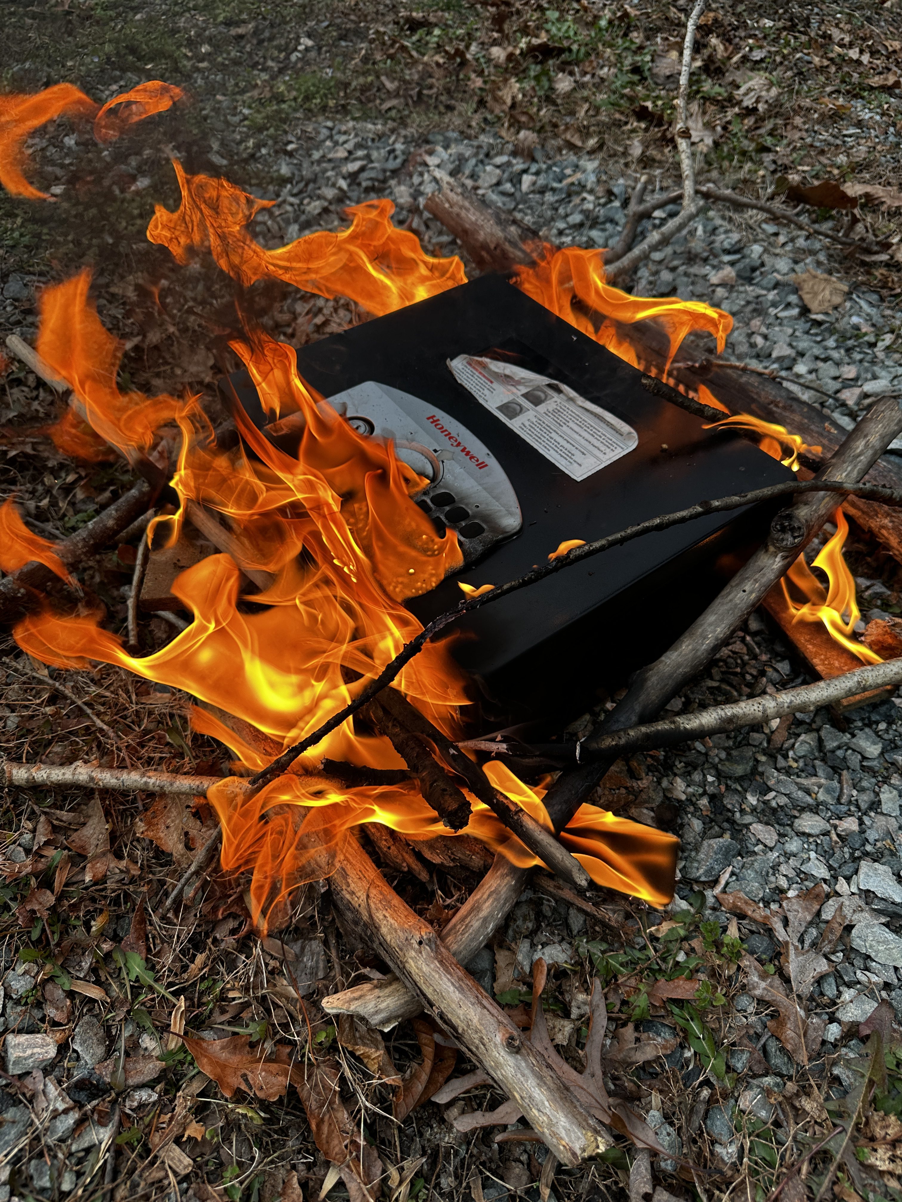 Going off the standard structure fire response time of less than 11 minutes, I put a cheap safe ($41) into a fire for ten minutes. This particular safe states a fire proof rating of 20 minutes at an unspecified temperature. A little diesel fuel, wood, and fire starters got the blaze going and it wasn’t long until the plastic components started melting. Then I heard pops coming from inside the safe, which I later found out were the batteries. At 10 minutes, the safe was looking crispy and the plumes of black smoke had my neighbors concerned. So I used a fire extinguisher and a bucket of water to put out the fire.