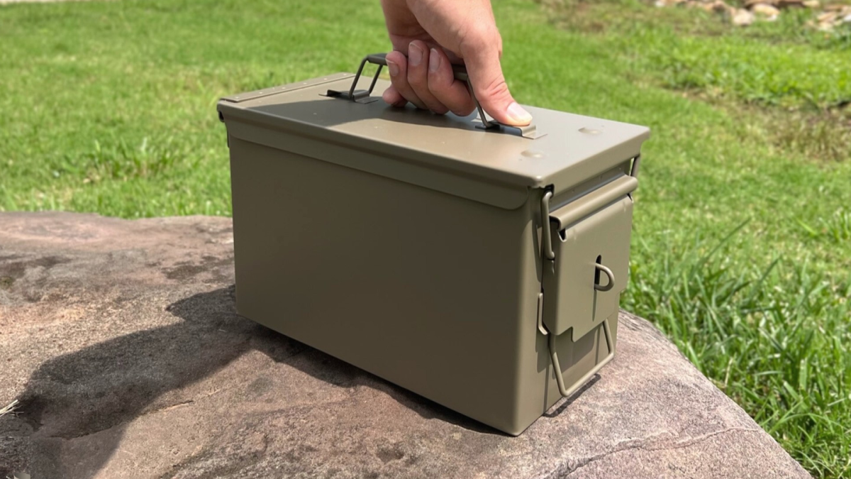 Made of durable alloy steel, Solid Tactical ammo cans are completely air- and watertight, so you can rest easy knowing your ammunition is protected from the elements. They feature a secure locking latch that’s welded on for added security, and come with customizable foam inserts for inside the can. The large 50-caliber ammo can is big enough to hold up to 2200 rounds of 9 mm ammo for reference.