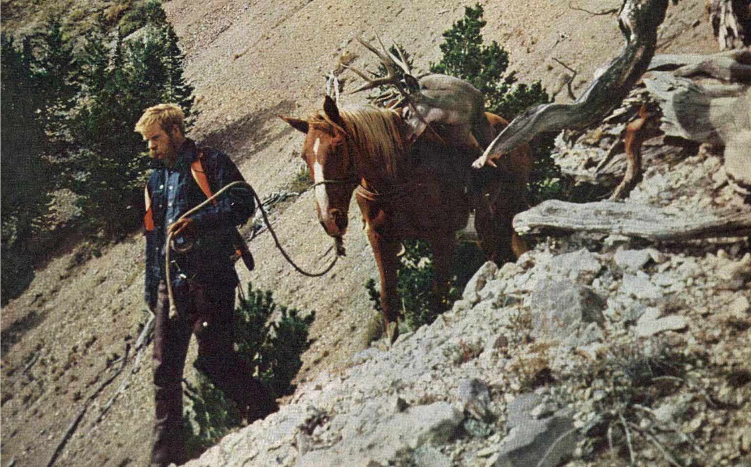 We were almost across the slide and had only one sharp switchback to go when Ozzie’s horse slipped and fell to its front knees. Twice it struggled to regain its footing, but each time more loose stones gave way and it fell again. Growing panicky, the animal lurched wildly, lost its footing altogether, and fell back toward me and my horse.