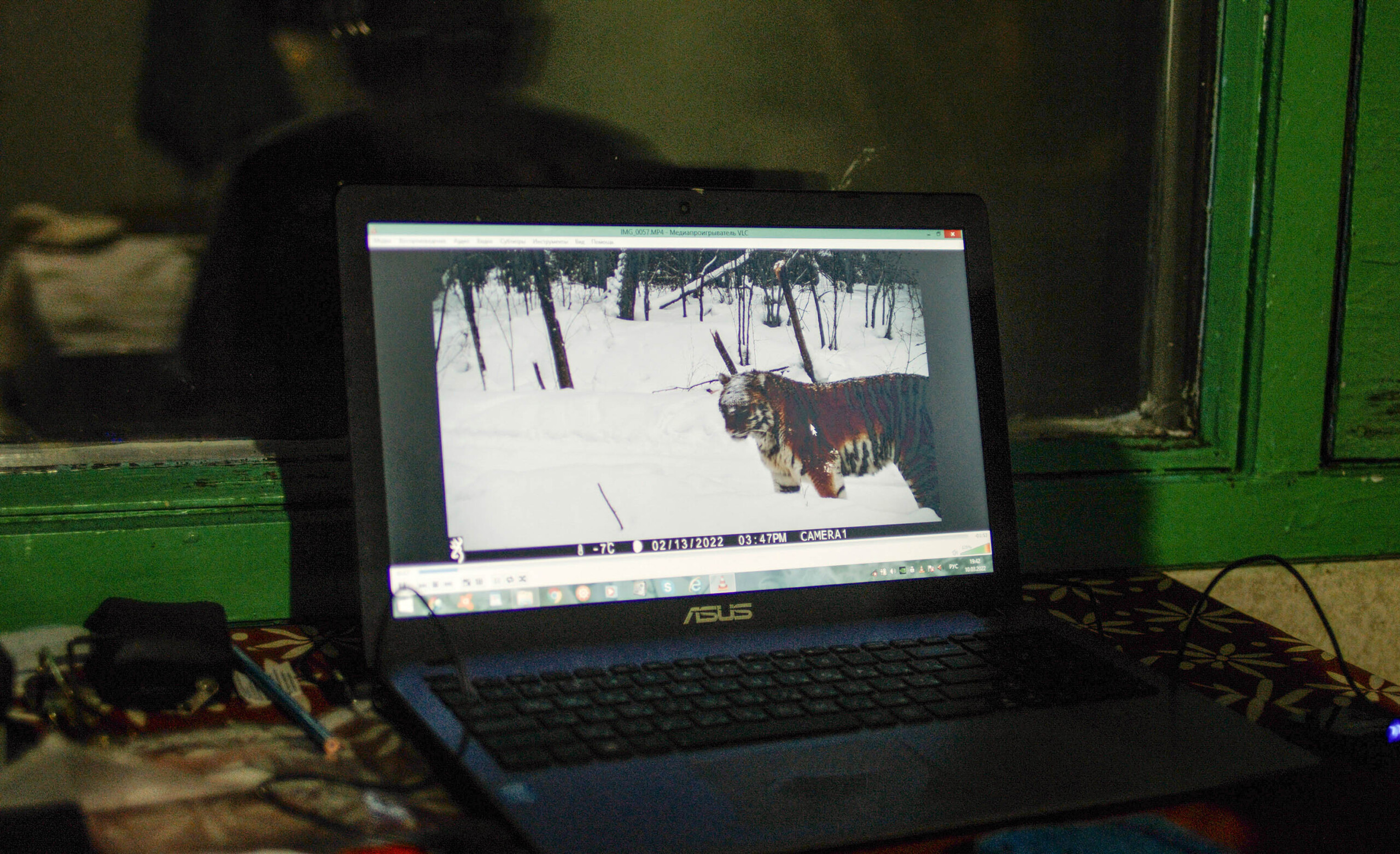 Sergei excitedly waves me over as he sorts through the camera footage and points to a large tiger gliding through the dark. She’s beautiful, and well-known to Alexander by the stripes on her skin. Having a sense of closeness and intimacy with this animal, Alexander shares her name: “Zholta boka” (yellow back), a reference to her unique striped pattern.