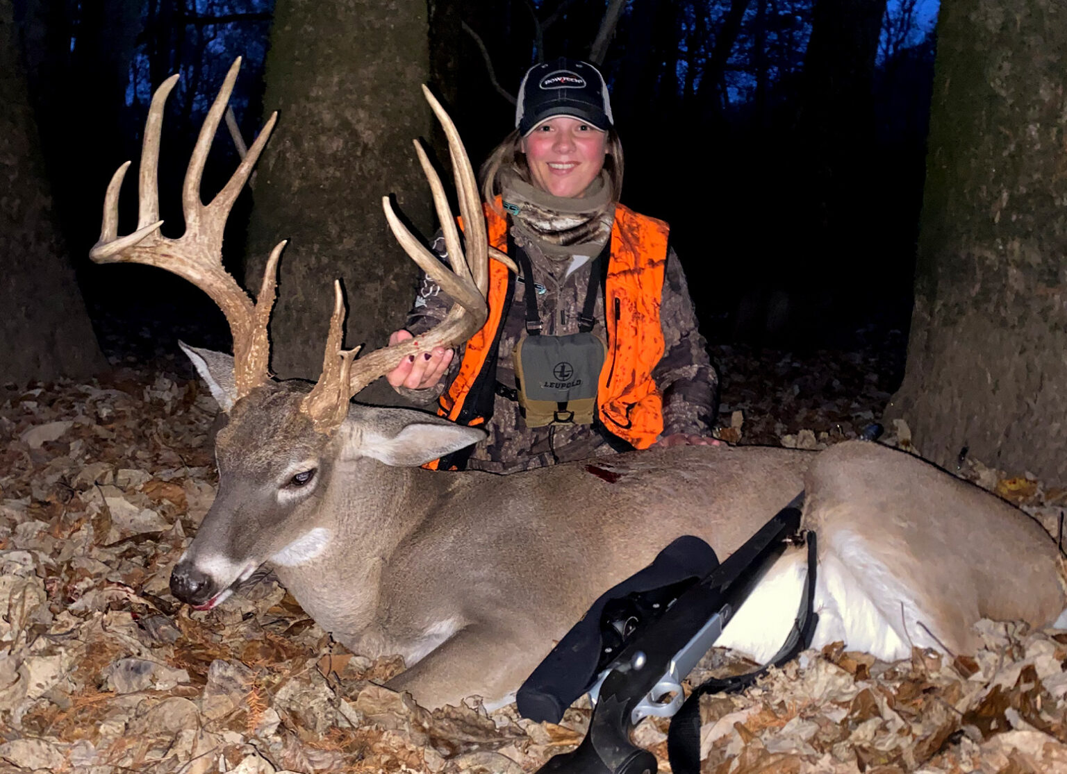 “There wasn’t much we could see, and I was getting anxious and wanted to stop looking and call for a tracking dog,” she says. “But just as I told Rick that, my dad found the buck in the woods. TT only ran about 70 yards.”