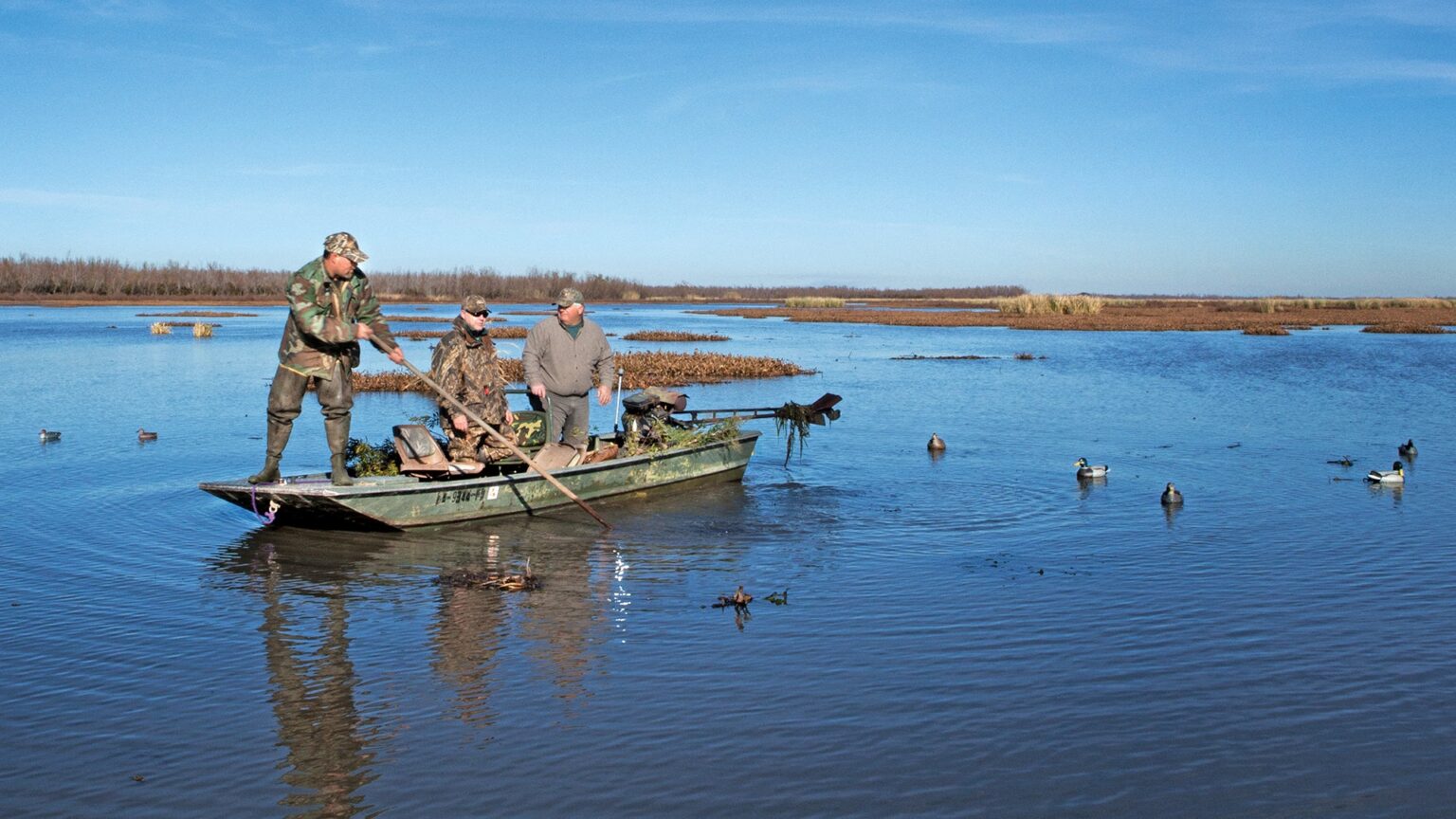 The next morning Eric’s dad, Jack, cooks up biscuits and gravy, then we trundle down to the boats, the Milky Way spangled overhead. I’m amazed at the heavy machinery brought to bear on delta ducks. We take the big aluminum workboat with a pirogue turned upside down on the deck, and pull a johnboat powered with a Go-Devil engine. It takes it all. We stake the workboat out in a pass of open water, then pile into the Go-Devil skiff, prop-chop through the water hyacinths, and shove with pushpoles to hide the boat in the marsh. Once again, a sweat-soaked shirt seems as common on a delta hunt as forearms slashed with cut-grass.