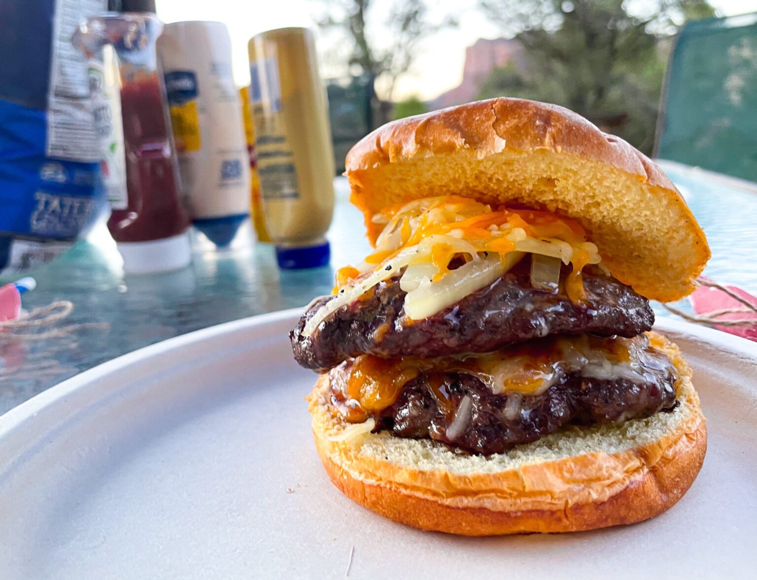 - Build your burger—toasted bun, burger with cheese, pickles, lettuce, tomato, onion, sauce(s) of your choosing—and enjoy.