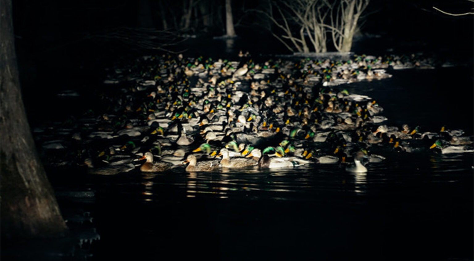 Loosier, who’s seen plenty of waterfowl in his time, explains that he’s never had so many ducks swimming so close to him. “And most of the time,” he adds, “when you see birds in those numbers, they’re swimming away from the light.”