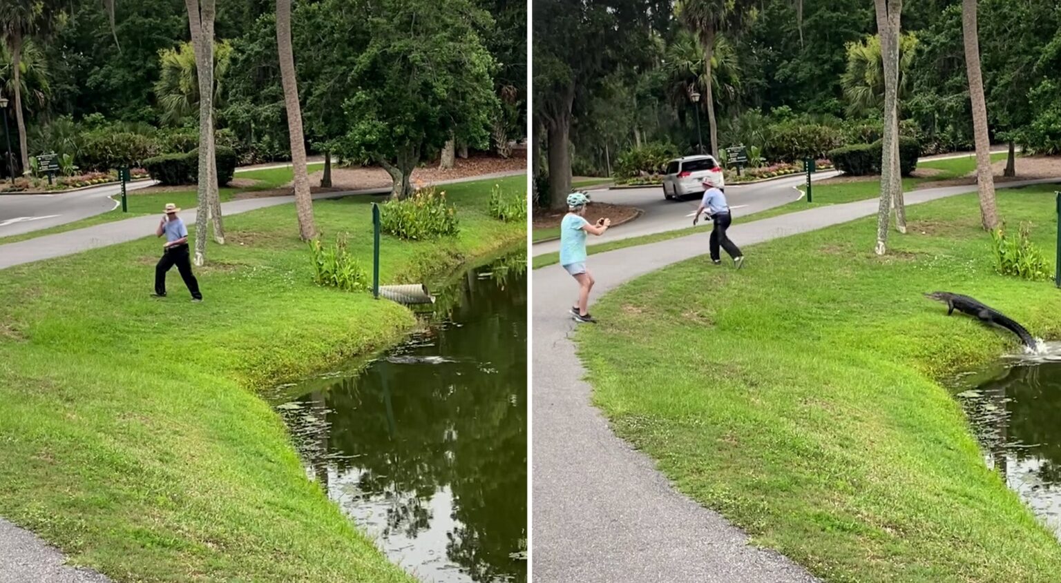 Still looking over his shoulder, the fisherman watches as the gator climbs up onto the bank. He then quickens his pace, and the aggressive gator sprints after him. The video ends with the fisherman running down the cart path and the gator chasing roughly 10 feet behind him.