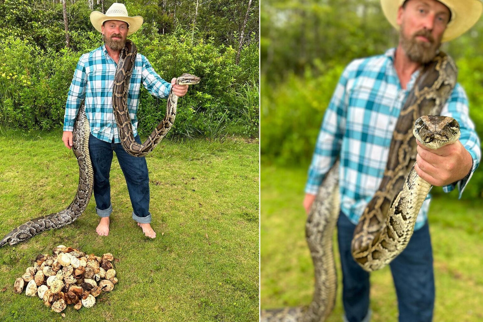 Brandon Rahe, who works with the FWC’s Python Action Team Removing Invasive Constrictors (PATRIC) program, hit the snake hunter’s jackpot—a 14-foot Burmese python mother and her huge clutch of eggs. “I’m lucky enough to have found (two) active nests so far, helping to remove future generations of monster snakes where they don’t belong,” Rahe wrote on his Facebook page.