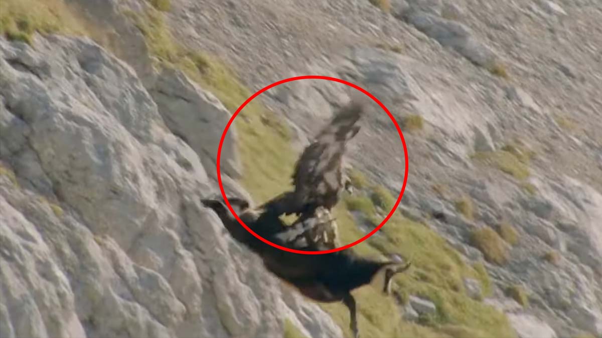 There’s not much information about the video, except that it was posted to YouTube by Untold Nature in 2020. The footage appears to be taken by a drone. The sequence begins by showing a golden eagle leaping from a cliff and soaring toward a herd of what appear to be chamois, a type of goat found in mountainous parts of Europe. The eagle seems to focus on a pair of chamois. It lands on the ground, then jumps on one of them and sinks its talons into its neck.