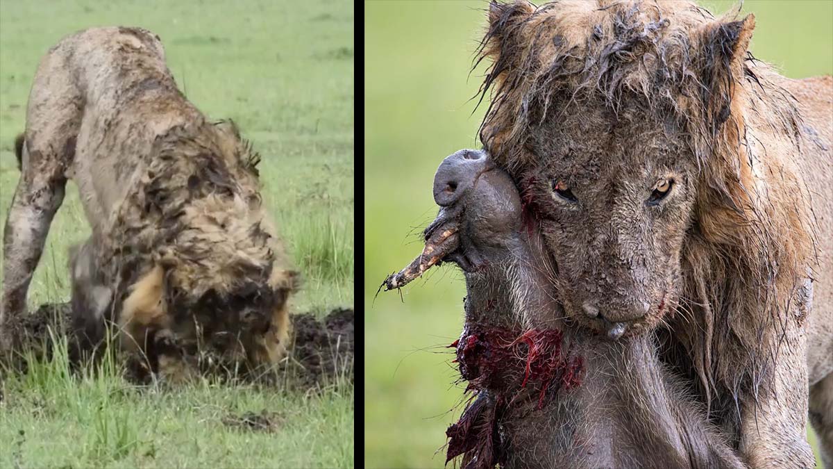 The hunt is far from graceful — but it’s quite the sight to behold the mud-covered lion digging a massive hole in the savanna and then holding a squealing warthog in its jaws.