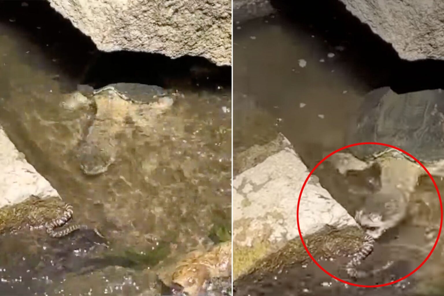 The video begins with a person filming from a rock overlooking a clear, flowing creek. Suddenly, the camera zooms in tight on the the sharp beak of a snapping turtle concealed beneath an overhanging rock. Then the turtle extends its neck and noses toward a brightly-colored snake in the middle of the creek.