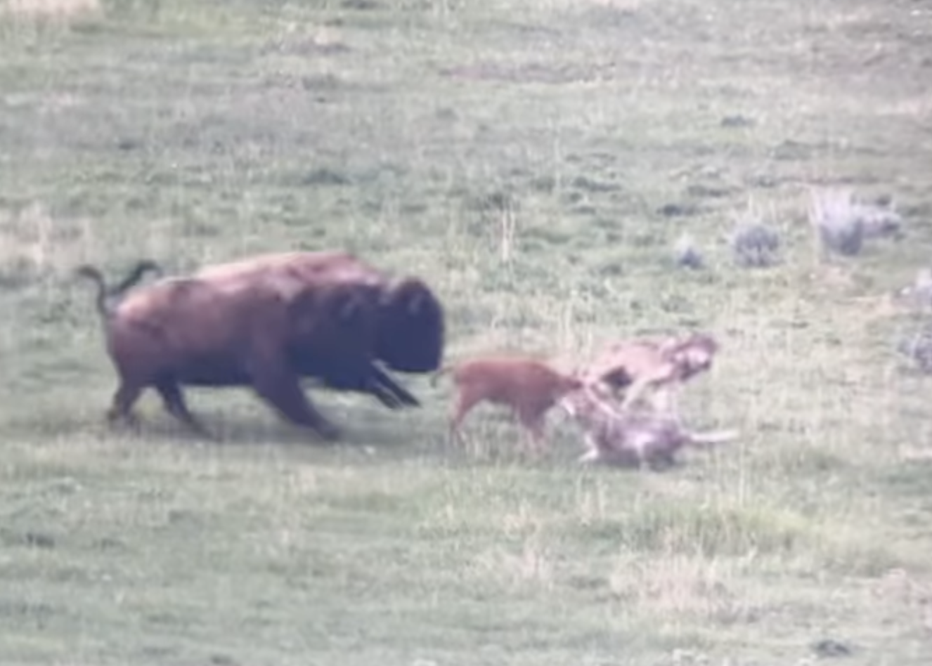 Watch Two Yellowstone Bison Rescue a Newborn Calf from Attacking Wolves